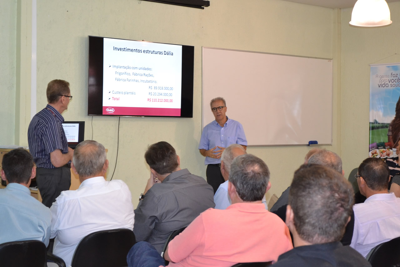 Prefeitos de 20 municípios dos vales do Taquari e do Rio Pardo sinalizaram interesse em serem parceiros da Dália Alimentos para a execução do Projeto ASA – Complexo Avícola. Em reunião realizada nesta quinta-feira, dia 25, no Centro de Cultura, em Encantado, detalhes do projeto foram apresentados pelo presidente Executivo Carlos Alberto de Figueiredo Freitas e pelo supervisor do Frango de Corte Pedro Raul Mallmann.