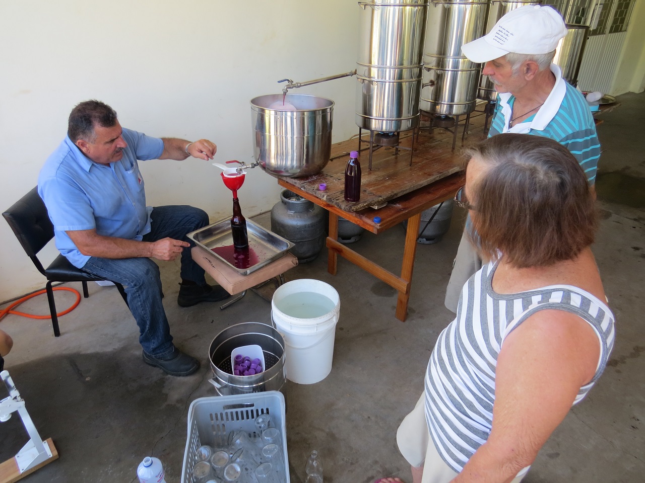 Em sua fala, o técnico explicou como cerca de 60 quilos de frutas – cada panela recebe 20 quilos -, podem se transformar em aproximadamente 36 litros de suco. Detalhes como a temperatura ideal para a fervura – que não deve ultrapassar os 85 graus Celsius, sob pena de deixar o suco com gosto de queimado – e o tempo de cozimento necessário – que deve ser de cerca de 2h30min – também foram explicados. De Maman não esqueceu as informações referentes à higiene, ao enfatizar que cada garrafa para envase deve ser desinfetada com álcool. “Também na hora de colocar o líquido na garrafa, é importante que o recipiente fique completamente cheio e bem vedado para que o produto não fermente”, enfatizou.