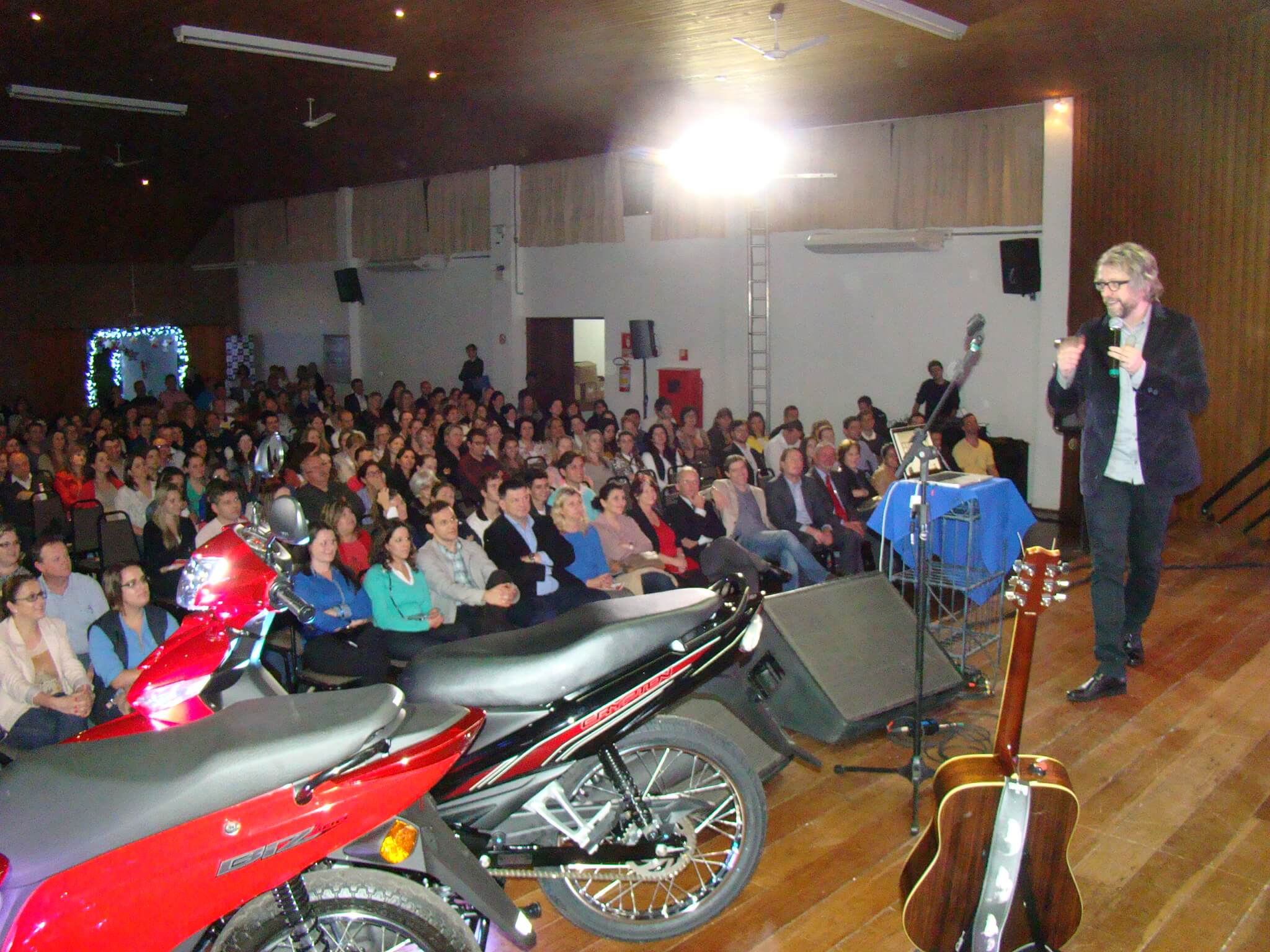 Além de empresários e comerciários, o evento contou com a presença de autoridades e representantes das empresas patrocinadoras e apoiadoras do Lajeado Brilha 2013: Benoit, Prefeitura de Lajeado, CDL Porto Alegre, Sicredi, Fruki, Motomecânica e Confiança Companhia de Seguros. A programação teve como atração especial a palestra do músico Thedy Corrêa, da Banda Nenhum de Nós. O artista provocou a plateia a imaginar o seu ambiente de trabalho como uma banda. Listou diferentes estilos musicais para caracterizar empresas e comparou perfis de profissionais e suas funções aos integrantes de um grupo musical. “Baixista, guitarrista, vocalista, cada um tem a sua importância numa banda. Assim é na empresa de vocês também. O trabalho em equipe é fundamental para o resultado final e todos precisam se sentir um pouco responsáveis, perceber o seu valor”, disse Thedy.